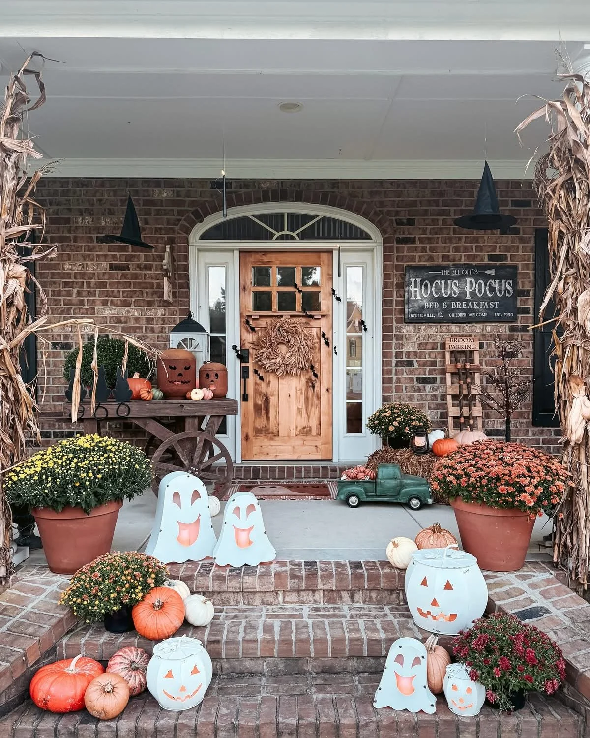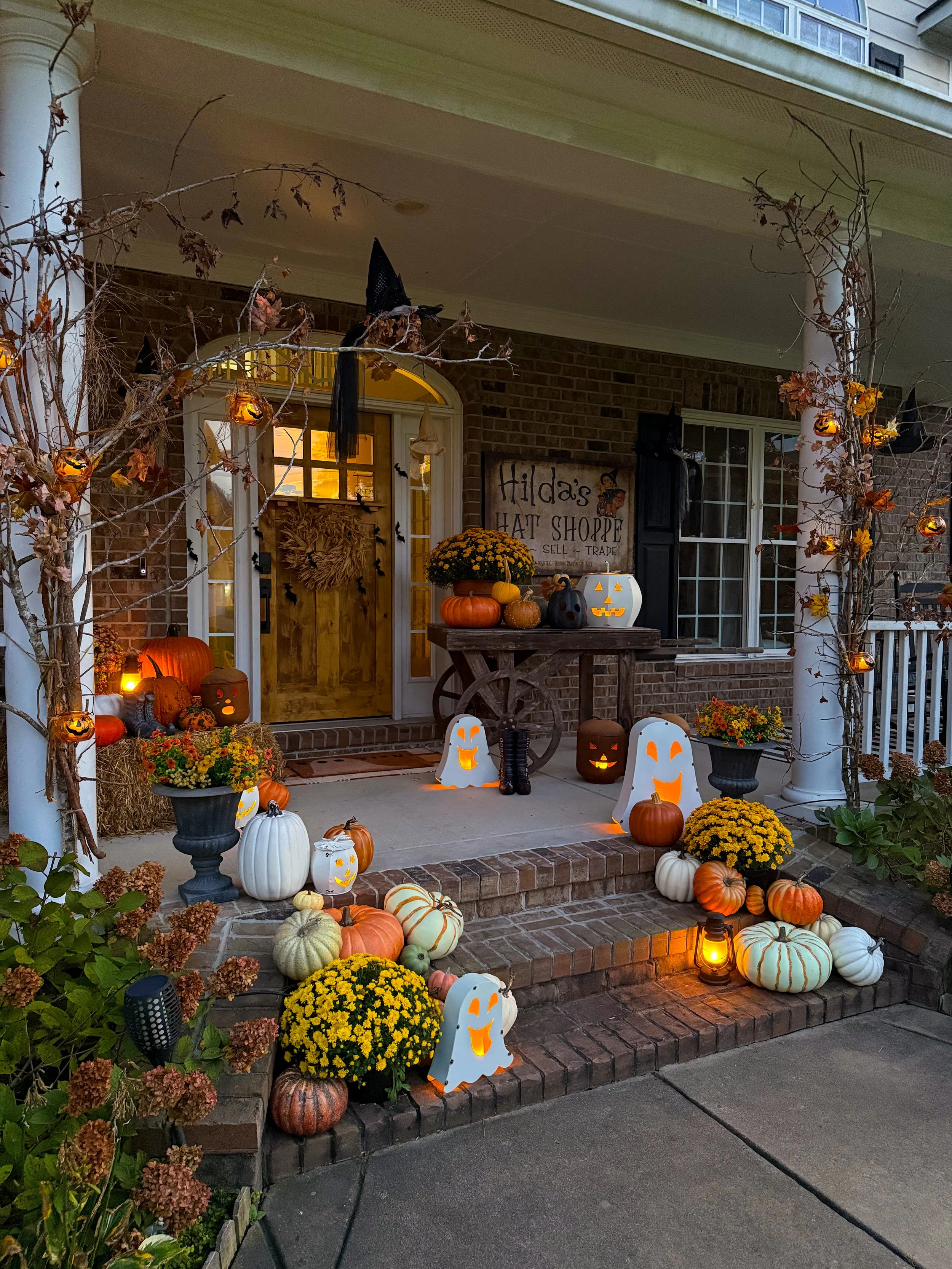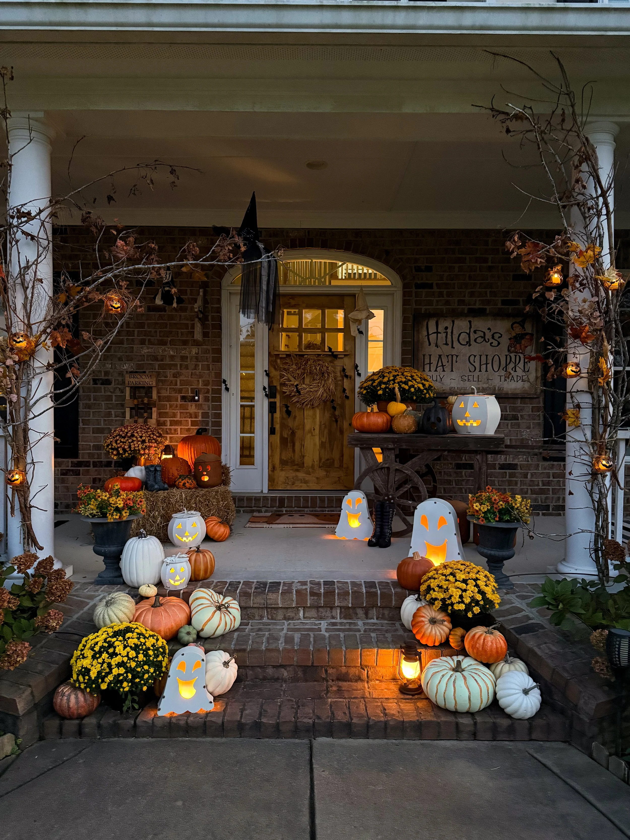 This is my falloween porch from last year and these ghosts, white jacks, and orange jacks up on the cart were a HUGE hit! They are currently available again, so below you’ll find the links for them all! They sell out fast so if you love them, don’t wait!