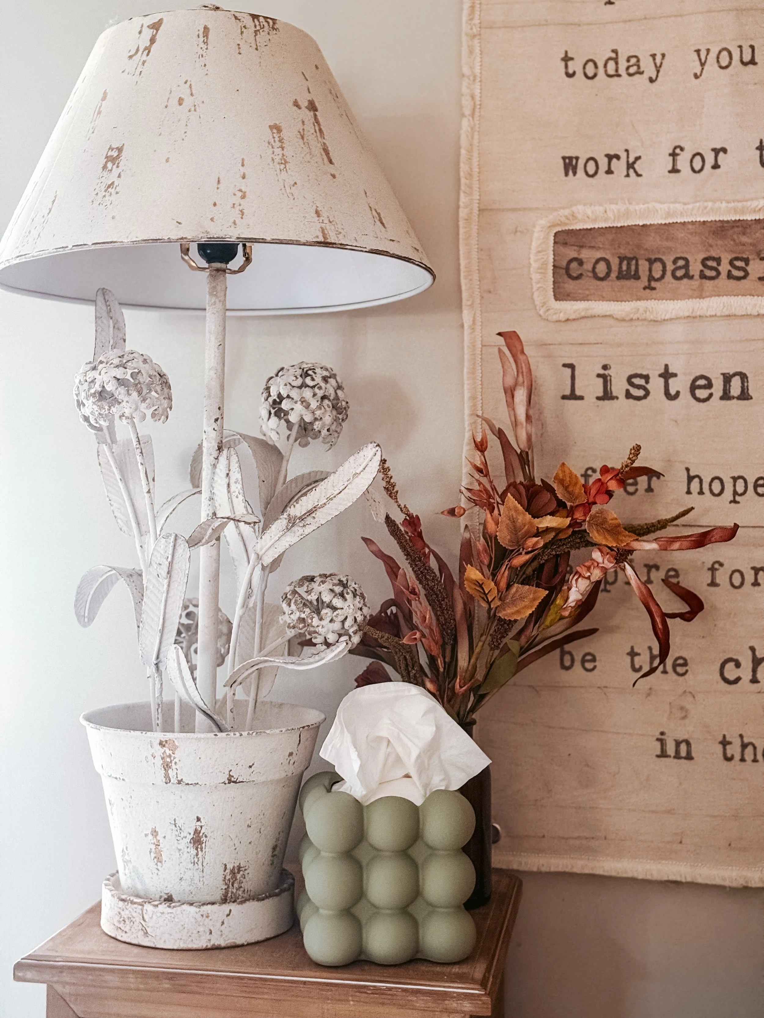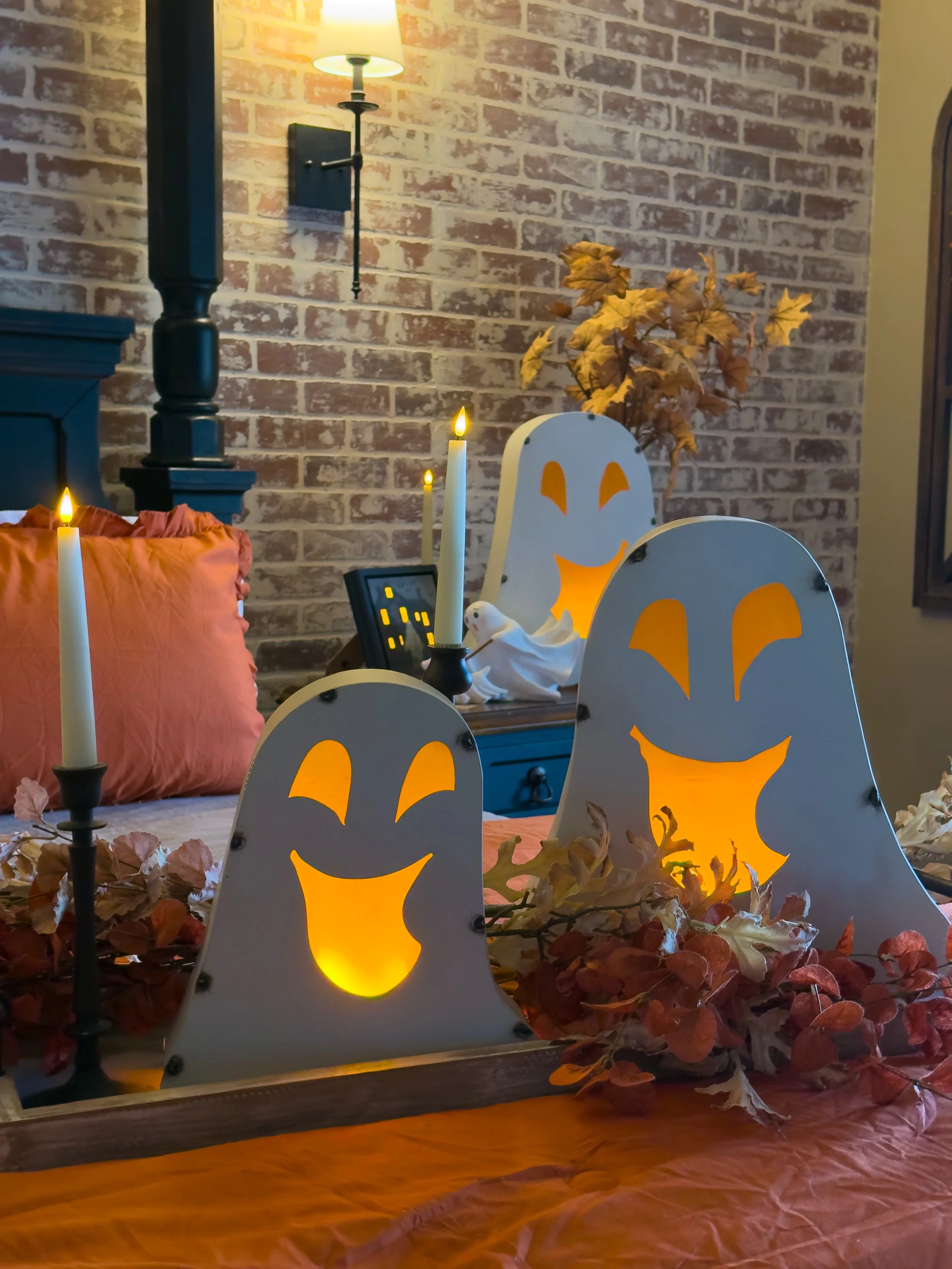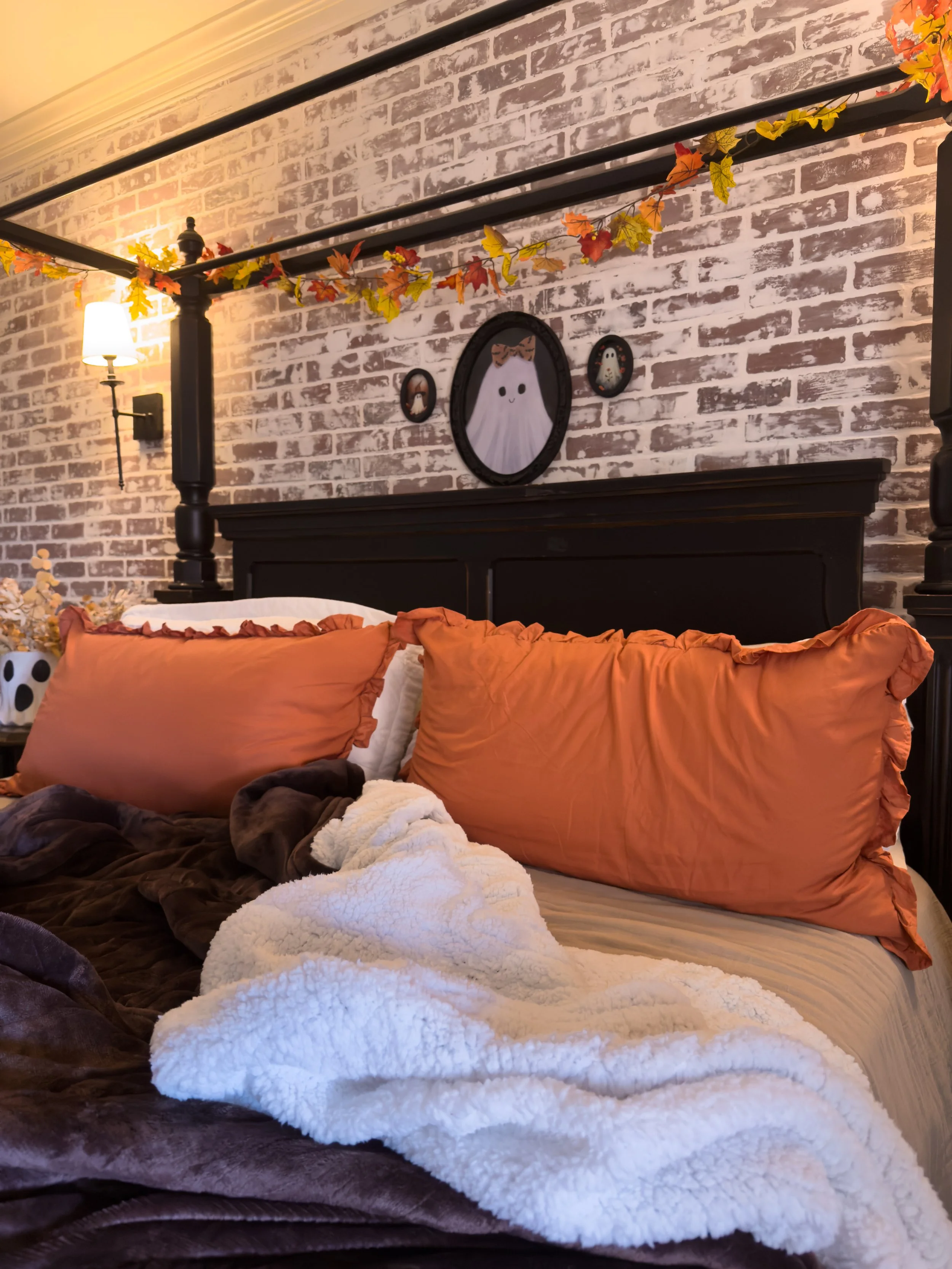 When I decorate for fall, I love to mix fall and Halloween together! Some cute ghosts (or witches), with some faux foliage and you have yourself the cutest space ever! Don’t forget the warm lighting with a small lamp!