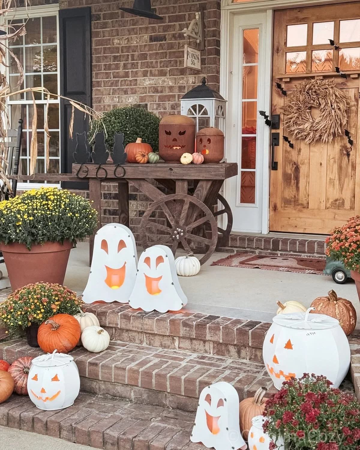 If you look up on my wooden cart, you’ll see my newest addition this year from MJ Home Decor! I couldn’t resist the ghost face on a pumpkin and he sets the perfect vibe! The large white Jack ‘o lantern next to it with a lid, and two others like it on my porch, are also from MJ Home! I partner with them, so you can take advantage of my discount code below! They are a small business so their product sells out fast and once it’s gone, it’s gone!