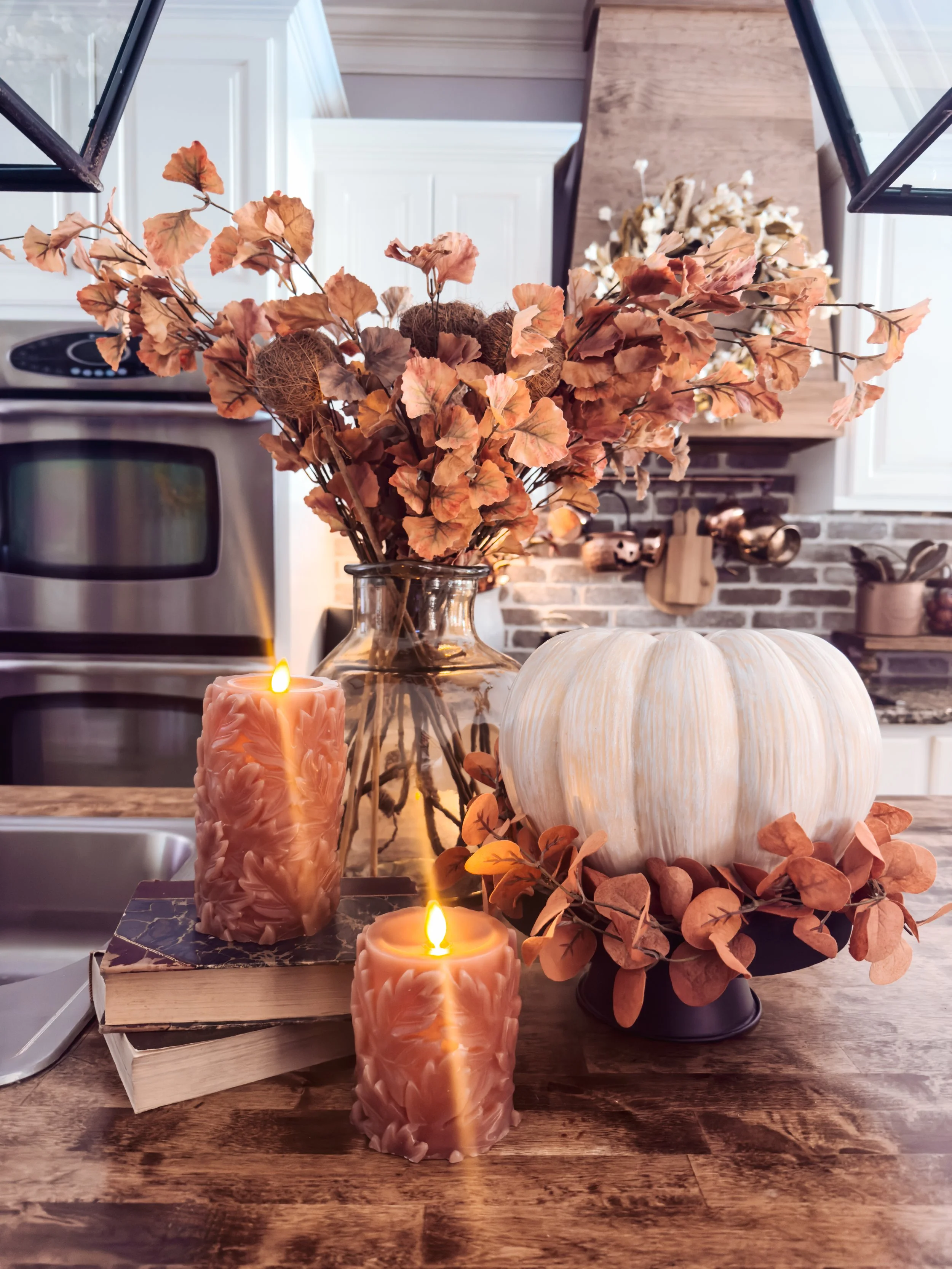 My gorgeous faux stems and vase are from, no other than, MJ Home Decor! I partner with them, so you can take 10% off these or anything site-wide using my code below! I ordered the brown and more orange stems and mixed them together in this beautiful vase, and I’m loving the more muted tones of fall this year! These stems are GORGEOUS and so realistic looking!